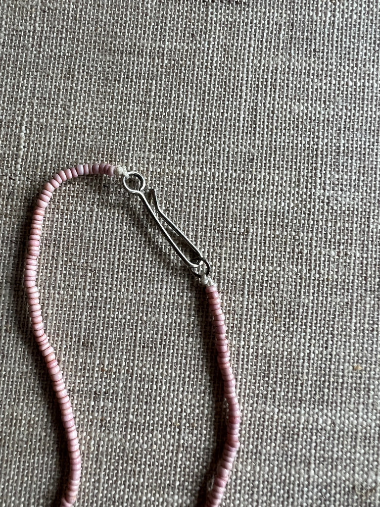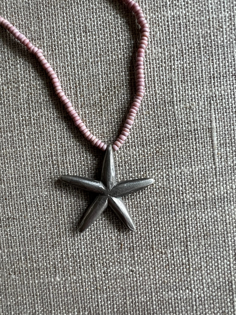 My slim sterling silver star (made using lost wax casting) slightly oxidised and strung on vintage glass African beads in a lovely pale pink. Bespoke clasp in sterling silver.