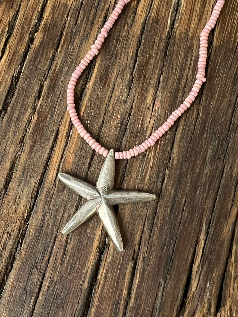CAST SILVER - Star Necklace on Vintage glass beads - pale pink star