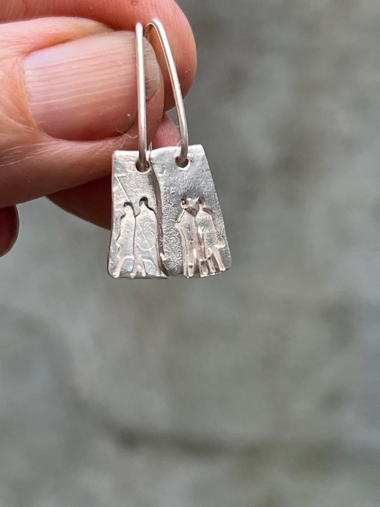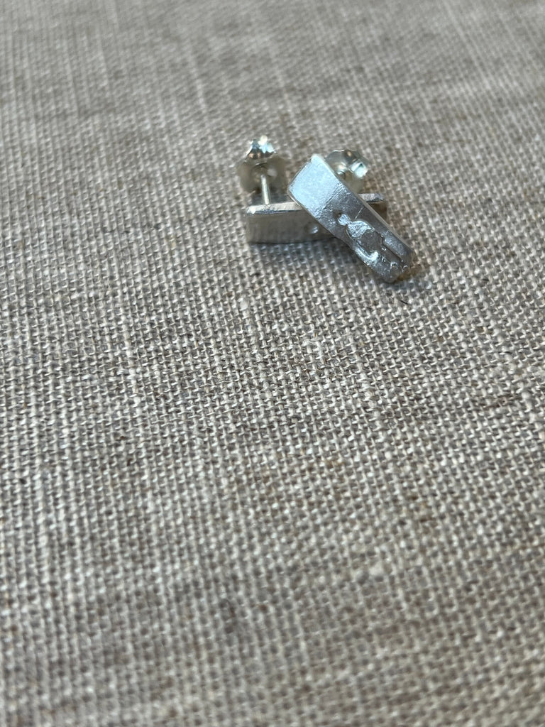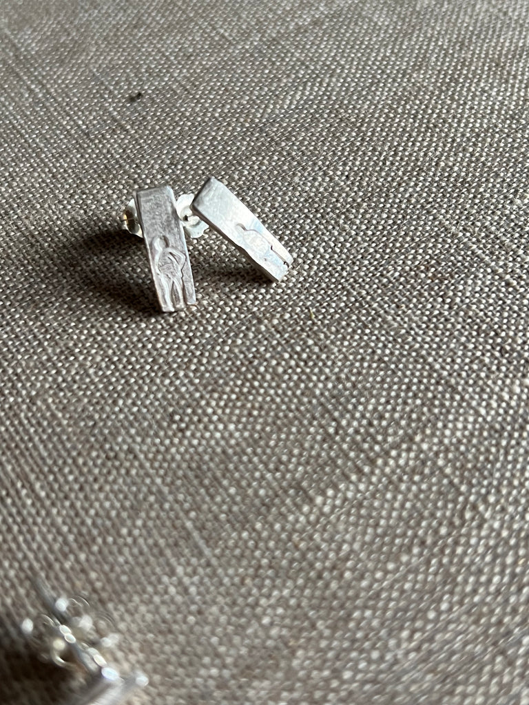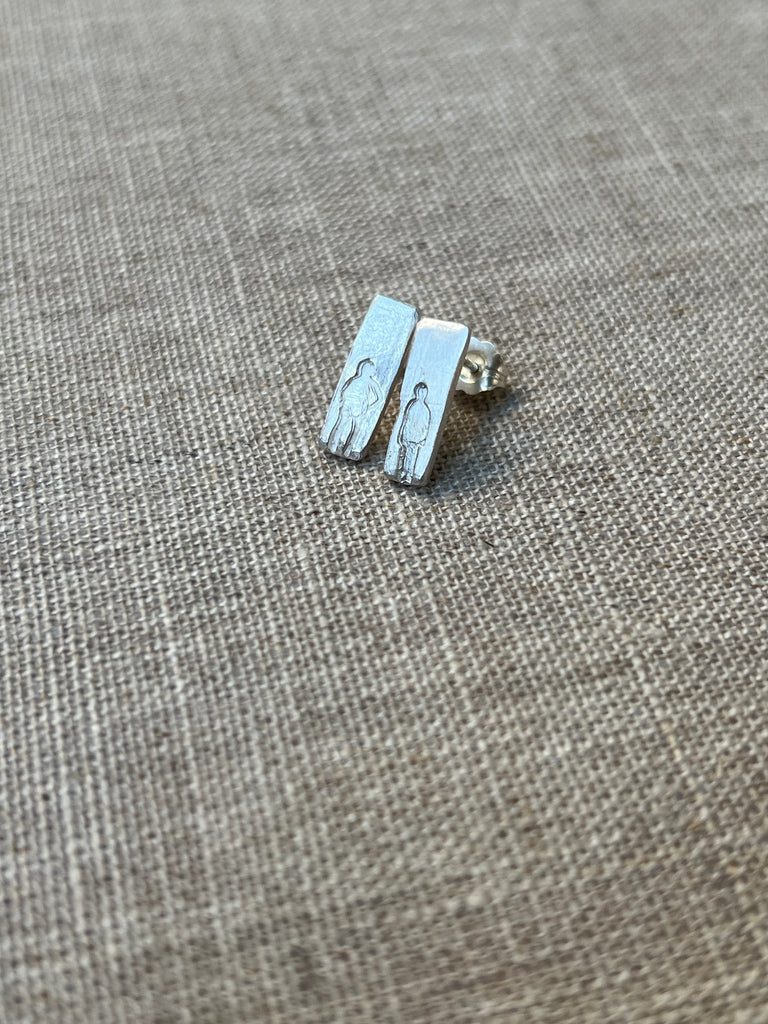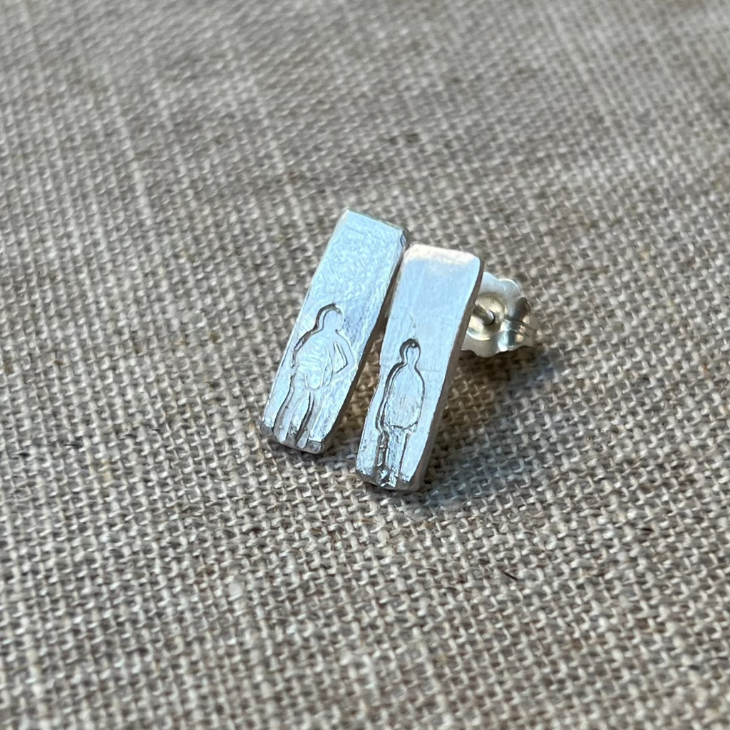 Cast recycled sterling silver FOLK stud earrings using the lost wax method. Architectural scale model (1:200) people have been used to imprint the wax. They measure approx. 14mm high x 3-5mm wide and are purposefully asymmetric on soldered sterling silver posts and butterflies. These are solid [recycled] sterling silver with a brushed matte finish.