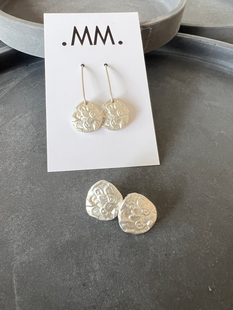CAST SILVER - silver impressed flower earrings - hand formed lost wax earrings MMCSE06